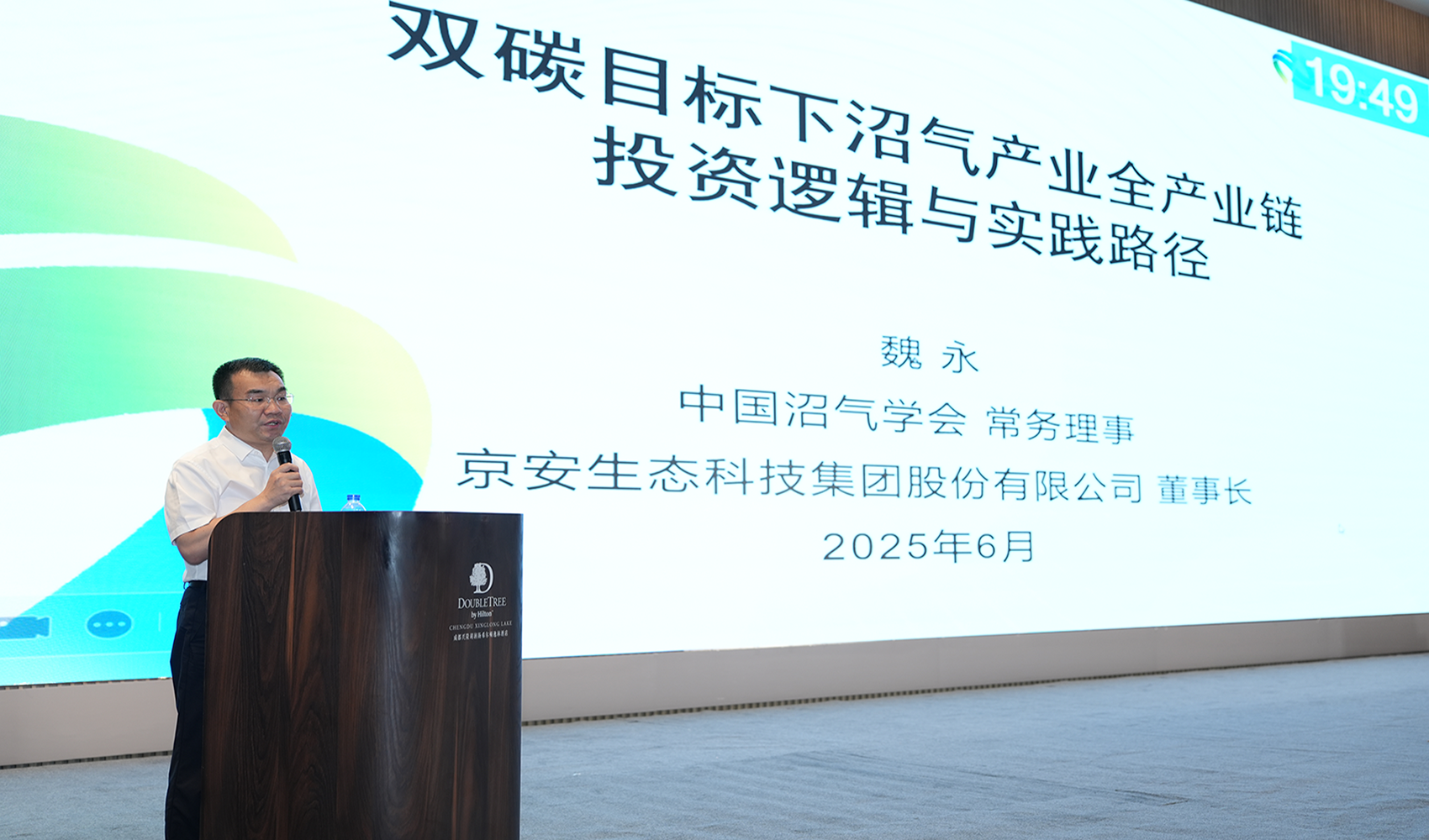 公司董事长魏永带队参加本次论坛,,,,并作了题为“双碳目标下沼气产业全产业链投资逻辑与实践路径”的主题报告,,,,介绍了沼气项目具有的显著的战略价值和广阔的市场前景,,,,是“双碳”背景下极具吸引力的投资方向之一。。。。其核心价值在于将环境治理压力转化为资源循环利用和清洁能源生产的动力。。。。建议行业同人戮力同心,,加强对外合作交流,,,促进生物天然气绿色生态价值的标准核准和国际互联互通,,,,为国家提出的双碳目标奋斗。。。