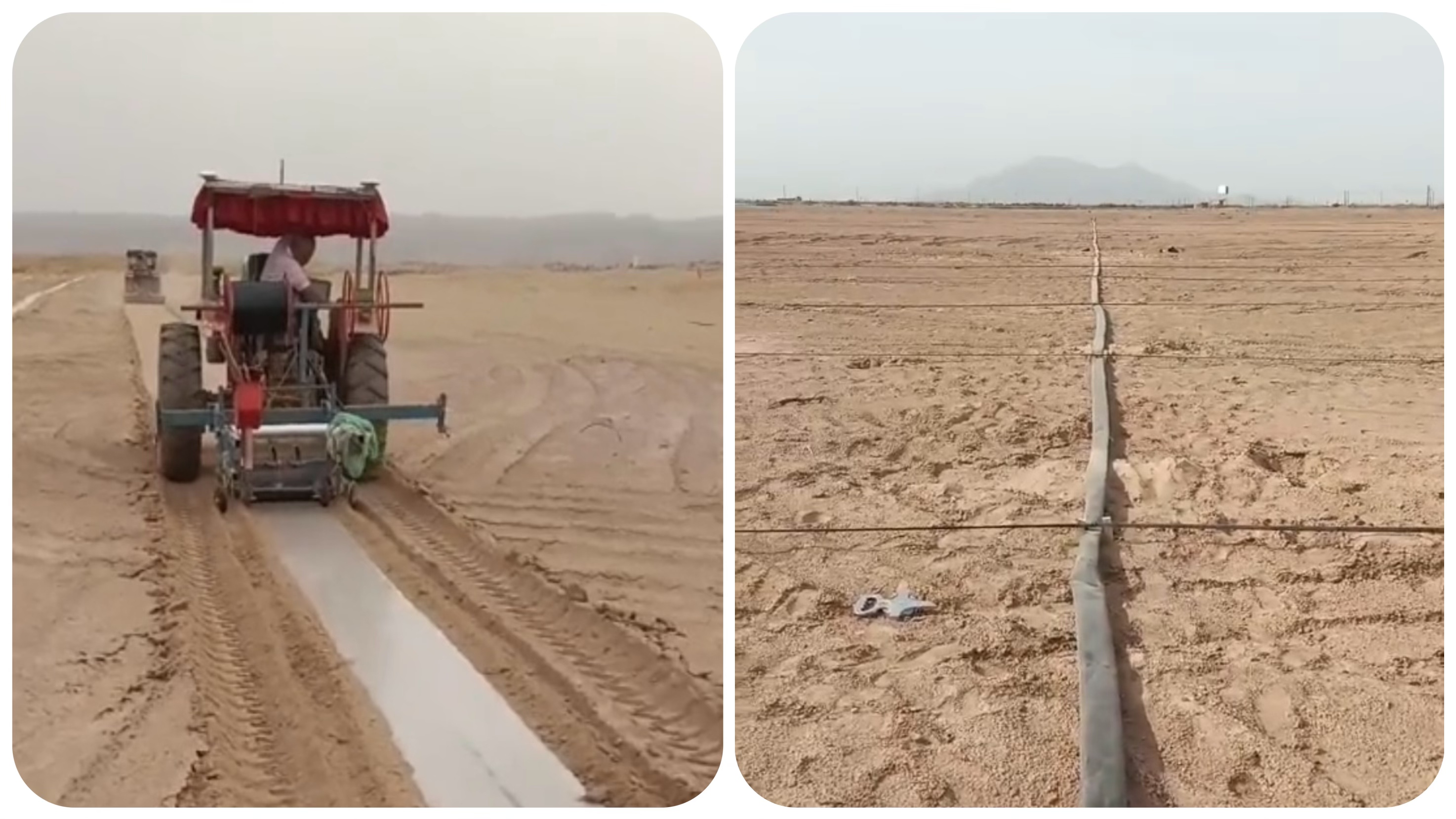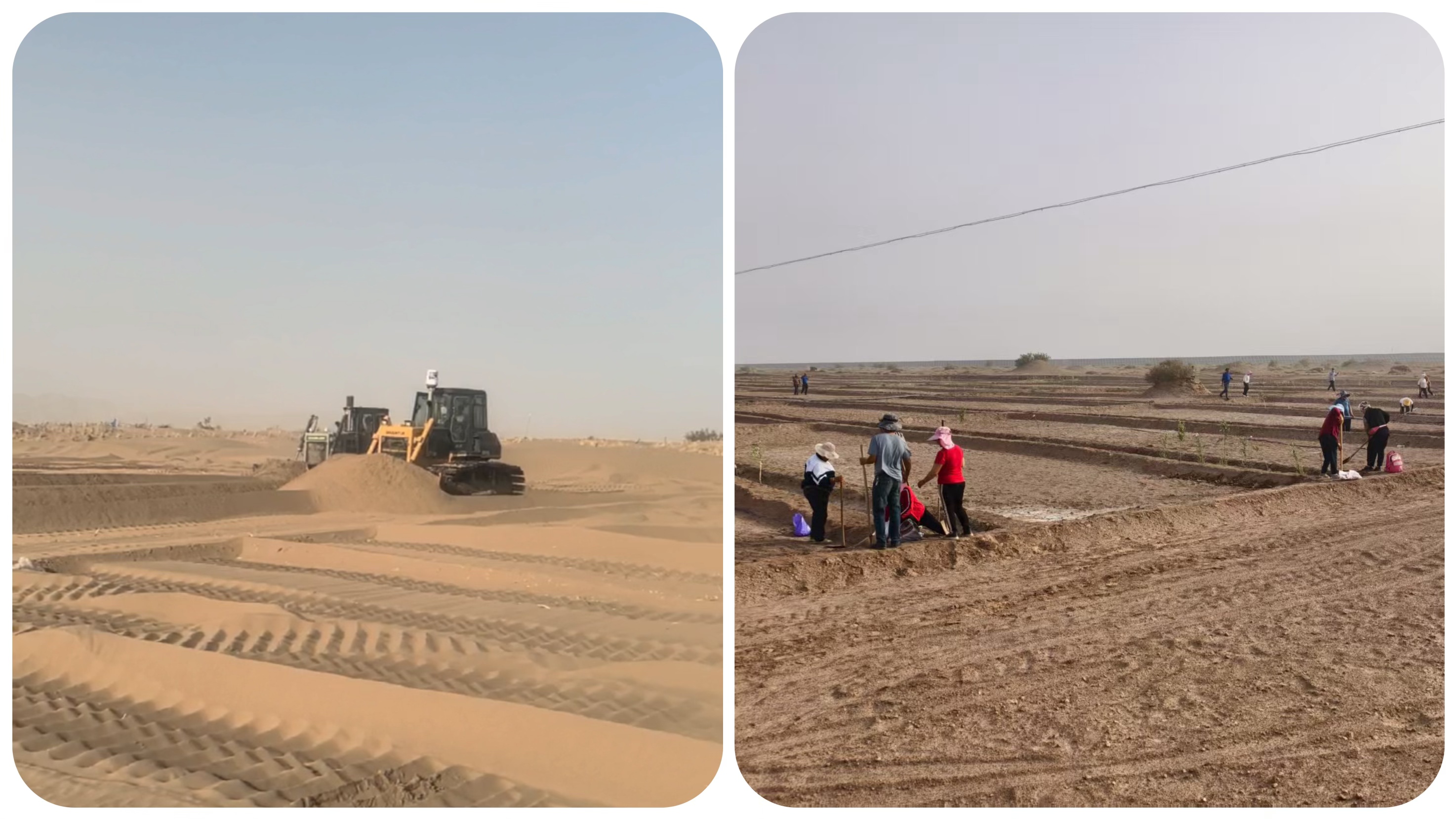 在项目现场,,,,多台大型机械忙碌地在沙漠中来回穿梭,,,,进行土地平整、、铺设地膜与滴灌管道作业,,现场机器轰鸣,,,,呈现出一派热火朝天的景象。。。。